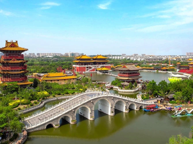 Đoàn tham quan dạo chơi tại công viên “Thanh Minh Thượng Hà Viên” là danh lam thắng cảnh cấp quốc gia, khu công viên chủ đề tuyệt đẹp tái hiện văn hóa, lịch sử thời nhà Tống. Tái hiện các trò chơi dân giân như: đá bóng nữ, đu dây trên mặt nước, gà bay, múa bóng cung đình, múa rối trên nước và múa theo nhạc Trung Hoa. Buổi tối, biểu diễn quy mô lớn sẽ giúp bạn ôn lại khung cảnh thời nhà Tống xưa.