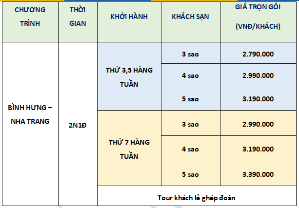 Lịch trình chi tiết tour TOUR BÌNH HƯNG - NHA TRANG KHỞI HÀNH TỪ CÂN THƠ