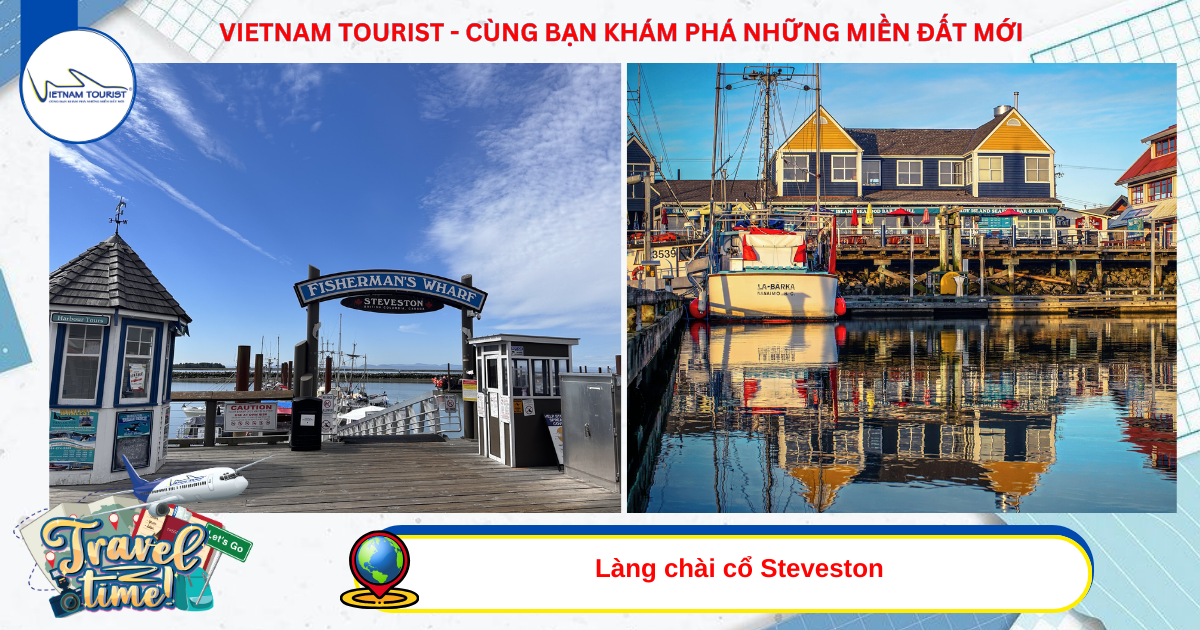 Làng chài cổ Steveston -có hẳn một tấm bảng liệt kê 101 điều bạn có thể cảm nhận khi bước chân vào. Nhưng thường thì khách du lịch thích nhất là được xem hải cẩu ở khu vực cầu cảng, tự tay cho mòng biển và vịt trời ăn, thuê thuyền gỗ đi câu cá, thưởng thức hàng trăm món ăn từ cá hồi tươi rói, chơi thả diều và cũng không thể bỏ qua thú lặng ngắm hoàng hôn tan dần trên từng lớp sóng biển.