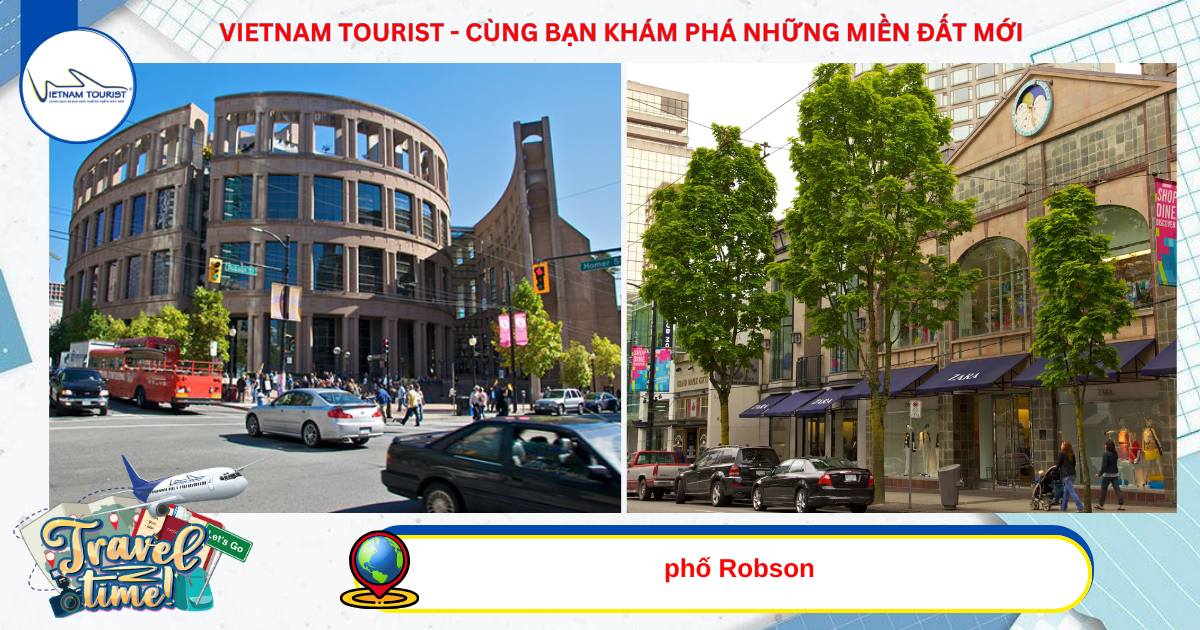 Quý khách tự do tham quan và mua sắm tại phố Robson - Khu bán hàng thời trang cao cấp sầm uất của thành phố Vancouver. Các cửa hàng thiết kế tên tuổi cùng những cửa hiệu thời thượng đã chọn đại lộ cao cấp này làm nơi đặt trụ sở của mình.