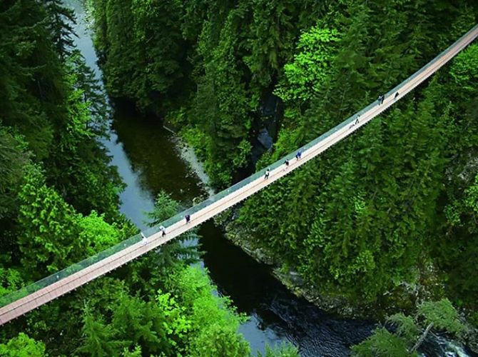 Trải nghiệm cảm giác "lơ lửng" trên cầu treo Capilano nổi tiếng cổ nhất, cao nhất và dài nhất thế giới. Với chiều dài khoảng 140 mét và độ cao khoảng 70 mét, Cầu treo Capilano tạo nên một địa thế hùng vĩ khi bắc qua dòng sông chảy mạnh bên dưới. Xung quanh Cầu treo Capilano là rừng cây bạt ngàn của công viên, tạo nên mảng xanh phủ kín tuyệt đối. Trong không gian ấy, thanh âm của suối chảy, chim hót đã vẽ nên một bức tranh tổng thể hoàn hảo cho cầu treo này..(Bao gồm vé lên cầu).