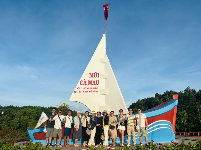 10h00:Đến Đất Mũi, qúy khách vào cổng tham quan quần thể thắng cảnh mũi Cà Mau vừa mới được khánh thành với nhiều công trình vô cùng đặc sắc như cột cờ, Đền Mẫu Lạc Long và tượng mẹ Âu Cơ. Ngoài ra, trên đường đi quý khách ngắm cảnh hệ sinh thái rừng ngập mặn Cà Mau. Quý khách ngắm cảnh và chụp ảnh lưu niệm tại Mốc tọa độ Quốc gia – GPS 0001, Panô biểu tượng Mũi Cà Mau, tham quan hệ sinh thái rừng ngập mặn phong phú tại Vườn Quốc Gia Mũi Cà Mau – Khu Dự trữ Sinh quyển Thế giới. Đặc biệt về lúc chiều tà, là thời điểm quý khách có thể ngắm hoàng hôn đẹp nhất tại đất nũi, chắc chắc rằng quý khách sẽ cảm nhận được 1 vẻ đẹp thật bình yên của khoảnh khắc mặt trời lặn ở nơi cuối cùng của bản đồ Việt Nam.