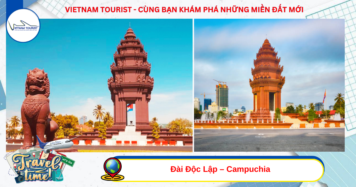 11h30: Qúy khách tiếp tục tham quan chụp hình tại Đài Độc Lập là Công trình khởi công năm 1958 và khánh thành ngày 9 tháng 11 năm 1962, kỷ niệm 9 năm độc lập của Campuchia từ tay người Pháp. Đài độc lập được xem là điểm tham quan thu hút đông du khách khi họ đến Phnom Penh.