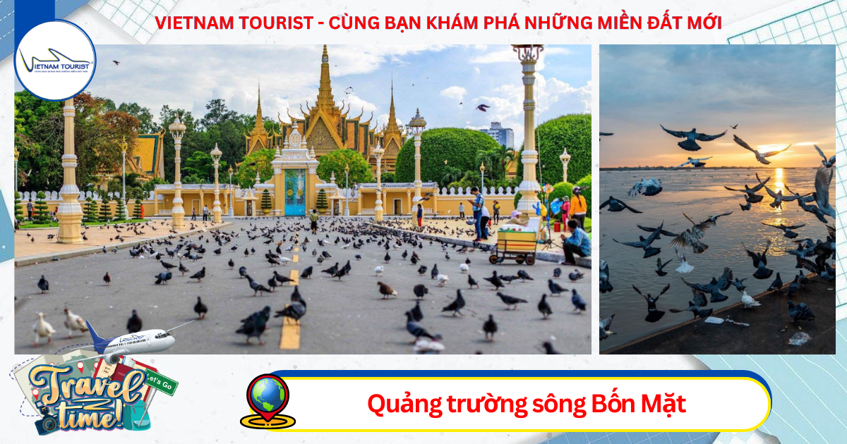 10h30: Quý khách đến check in Quảng trường sông Bốn Mặt: Là một khu vực ven sông lịch sử nằm ở Phnom Penh, Campuchia, song song với Đại lộ Sisowath ở quận Chamkarmon. Quảng trường nằm dọc theo nơi giao nhau của Sông Mekong và Biển hồ Tonlé Sap, nằm gần Hoàng Cung Campuchia.