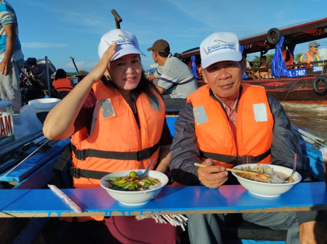 06h00: Chiếc tàu du lịch sẽ rời chợ nổi và đưa quý khách đến lò hủ tiếu. Tham quan mô hình sản xuất hủ tiếu truyền thống. Tại đây còn nổi tiếng với món bánh Pizza được làm từ hủ tiếu. Qua một vài công đoạn đơn giản như ướp gia vị vào sợi hủ tiếu, chiên hủ tiếu cho vàng, cho thêm giăm bông, tuỳ theo ý thích của du khách muốn thưởng thức, sẽ có ngay bánh pizza hủ tiếu ròn rụm hấp dẫn (chi phí tự túc).