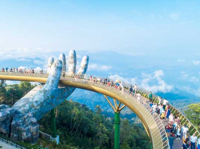 13h00: Qúy khách lên cáp treo di chuyển đến cây Cầu Vàng (Cầu bàn tay phật). Từ trên cáp treo , quý khách sẽ thấy cây Cầu Vàng hiện ra giữa mây trời và núi non trùng điệp. Cầu vàng nằm ở độ cao hơn 1,400m so với mực nước biển, và là một điểm du lịch hấp dẫn vì nó có tầm nhìn tuyệt đẹp ra quan cảnh xung quanh.