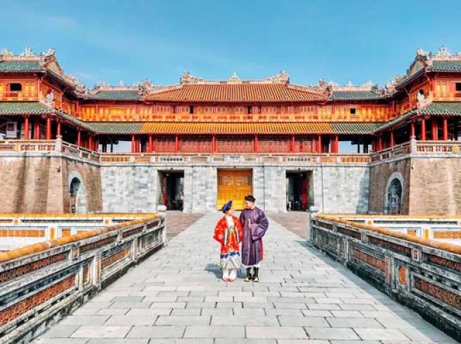 08h00: Qúy khách bắt đầu hành trình khám phá Đại nội Huế là một trong những di tích lịch sử thuộc quần thể di tích cố đô Huế, được xây dựng và bảo tồn từ thời đại nhà Nguyễn. Đại Nội Huế có thể xem là một công trình có quy mô lớn bậc nhất trong lịch sử Việt Nam. Đây chính là nơi sinh hoạt của vua chúa Nguyễn và triều đình phong kiến cuối cùng của Việt Nam. Đến với Đại Nội Huế, quý khách sẽ được chiêm ngưỡng vẻ đẹp nguy nga của cung điện, nét cổ kính, bề thế của đền đài và miếu thờ. Cụm di tích bao gồm Hoàng Thành (nơi vua thiết triều) và Tử Cấm Thành (nơi sinh hoạt của vua và hoàng tộc). Ngoài ra, mỗi khu vực còn có nhiều công trình nổi tiếng khác như Điện Thái Hòa, Cổng Ngọ Môn, Điện Cần Chánh,…
