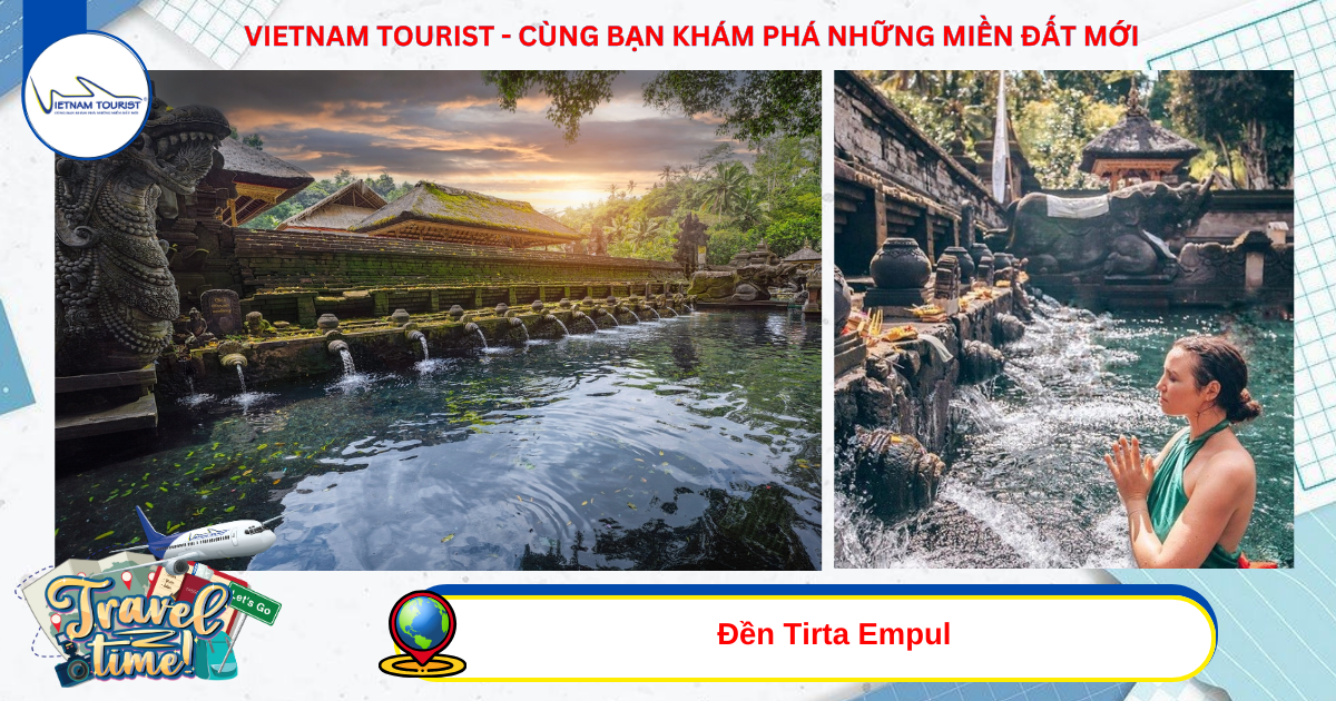 Đền Tirta Empul: ngôi đền được tôn thờ như là đời sống tinh thần của người dân địa phương, là nơi làm thanh lọc tâm trí, linh hồn tan biến những lo toang, muộn phiền, tội lỗi hay những ảnh hưởng xấu trong cuộc sống. Phía trước đền là hồ nước thiêng... dù là dân địa phương hay người theo đạo Hindu đến từ các nơi trên thế giới khi tới Tampak Siring đều có ước nguyện được tắm mình qua mười hai dòng chảy thiêng liêng, với mong muốn được gột rửa bụi trần, gột rửa những điều không may mắn trên cơ thể và linh hồn, muốn được thần linh ban phước, vuốt ve và che chở, mang lại cho họ một cơ thể mạnh khỏe, một tâm hồn thanh tịnh và một trí tuệ minh mẫn.