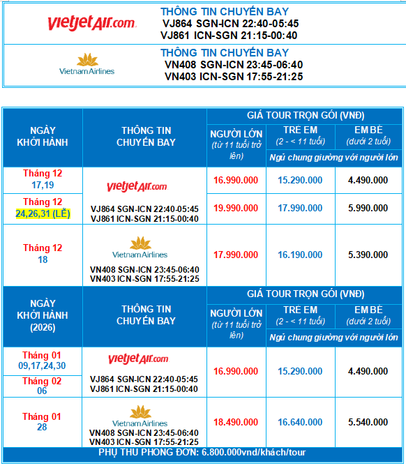 - Vé máy bay khứ hồi theo đúng chương trình của hãng hàng không VIETJET AIR,VIETNAM AIRLINES (SGN-ICN-SGN)