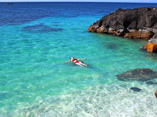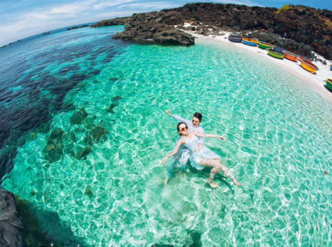 07h00: Qúy khách tập chung tại cảng để lên thuyền đi tham quan đảo bé An Bình (từ Đảo Lớn sang Đảo Bé thời gian 8 phút). Toàn đảo bé An Bình là một hệ thống núi lửa loang lổ đã phun trào hàng triệu năm đang xen với những bãi cát trắng mịn chạy dọc quanh đảo tạo nên một bức tranh hiền hòa thơ mộng.