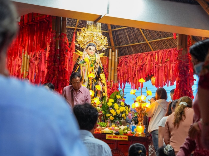 14h30: Đoàn di chuyển đến Chùa Liên Hoa – Mẹ Nam Hải, nơi nổi tiếng với tượng Quan Âm Nam Hải cao 20m hướng ra sông Tiền. Quý khách dâng hương, chiêm bái, cảm nhận không gian thanh tịnh và khấn nguyện bình an cho gia đạo.