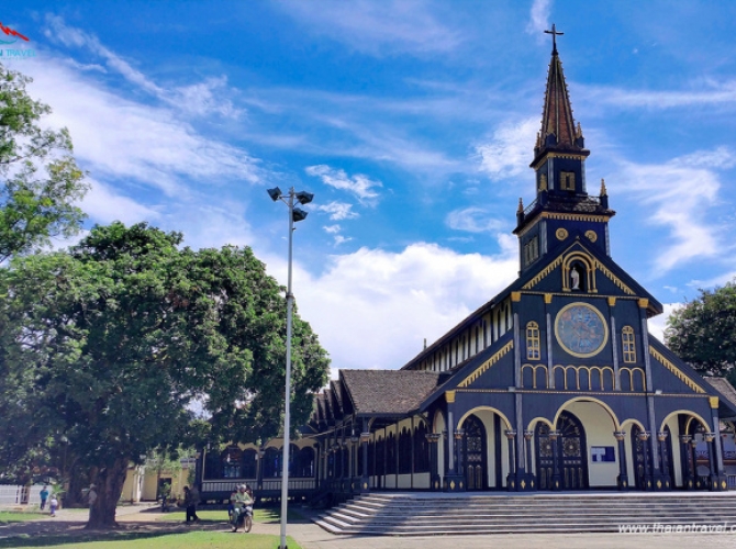 09h00: Quý khách đến TP. Kon Tum, Qúy khách ghé thăm quan Nhà thờ chánh tòa Kon Tum, hay còn gọi là nhà thờ gỗ Kon Tum, là nhà thờ đẹp nhất Tây Nguyên - một trong những điểm du lịch không thể bỏ qua nếu như bạn có dịp đến thăm vùng đất đại ngàn. Đây không chỉ là một công trình kiến trúc tôn giáo bằng gỗ vô cùng độc đáo với hơn 100 năm lịch sử mà còn là kiệt tác kiến trúc gỗ mang phong cách Basilica còn tồn tại duy nhất trên thế giới.