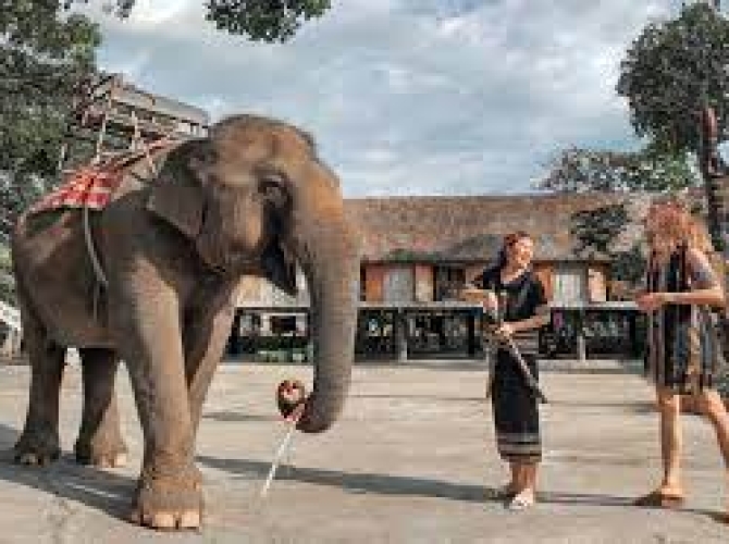10h30: Qúy khách tiếp tục tham quan nhà sàn cổ được xây dựng theo kiến trúc Lào đã tồn tại trên 120 năm, tham quan mộ Vua săn voi “KhunJuNốp” và nghe chuyện kể về Vua săn voi. Hoặc đăng kí cưỡi voi đi dạo lững thững bên bờ sông ngắm trọn vẹn bảy nhánh thác, hoặc lên thuyền đi dạo dọc dòng sông Serepok, tha hồ ngắm nghía cánh rừng Khộp Yokdon, những đàn chim bay về rừng trong áng chiều rực rỡ.(Chi phí tự túc)