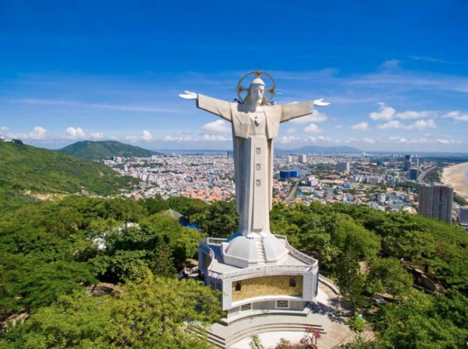 09h30: Xe đưa quý khách đi tham quan "Tượng Chúa Ki Tô", tượng chúa lớn nhất Đông Nam Á hiện nay, toạ lạc trên đỉnh Núi Nhỏ hay còn gọi là núi Tao Phùng. Quý Đoàn lên hai cánh tay dang rộng đến 18.5 m để ngắm nhìn toàn cảnh thành phố biển Vũng Tàu – thành phố ven biển đầy thơ mộng nơi được thiên nhiên ưu đãi.