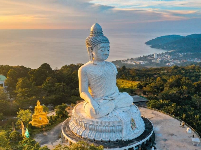 Tượng Phật lớn Big Buddha tọa lạc trên đỉnh Nagakerd chiều cao 45m nặng khoảng 135 tấn được trang trí bằng đá cẩm thạch Miến Điện, đây được coi là biểu tượng của niềm hi vọng, khát vọng sống hướng thiện của người Thái. Từ đây quý khách có thể chụp hình lưu niệm, ngắm toàn cảnh bờ biển Andaman từ trên cao