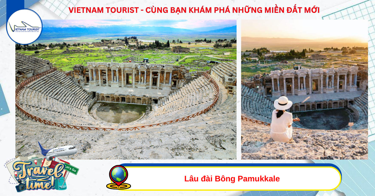 Lâu đài Bông Pamukkale: Một di sản thiên nhiên thế giới, nơi có những dòng suối khoáng nóng chảy tự nhiên lộ thiên từ hàng ngàn năm trước tạo nên một kỳ quan vô cùng kì vĩ và độc đáo, cũng được UNESCO công nhận là di sản văn hóa thế giới. Tơi đây du khách có thể ngâm mình vào dòng nước nóng này để thư giãn.